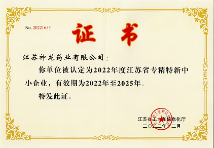 近日,江蘇省工業和信息化廳公布了2022年江蘇省“專精特新”中小企業名單。神龍藥業從萬千企業中脫穎而出,成功通過申報、評審和公示等程序,榮獲省級“專精特新”中小企業稱號。
